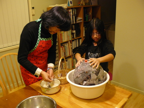 2. 報紙沾滿自製醬糊,整齊地貼在氣球上。貼好一層後---> 可以去休息吧,因為你要等它乾了才能上第二層的報紙。